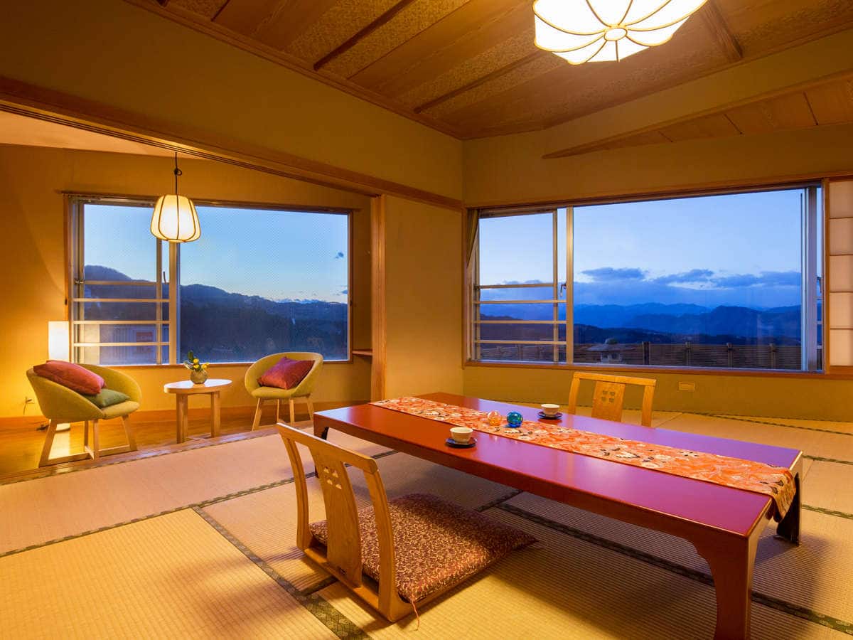 最上級の客室「貴賓室」のリビング、ベッドルーム、お風呂を映します。広さ206㎡の客室では、広いリビング、天望風呂、開放的なベッドルームで非日常を味わっていただけます。
