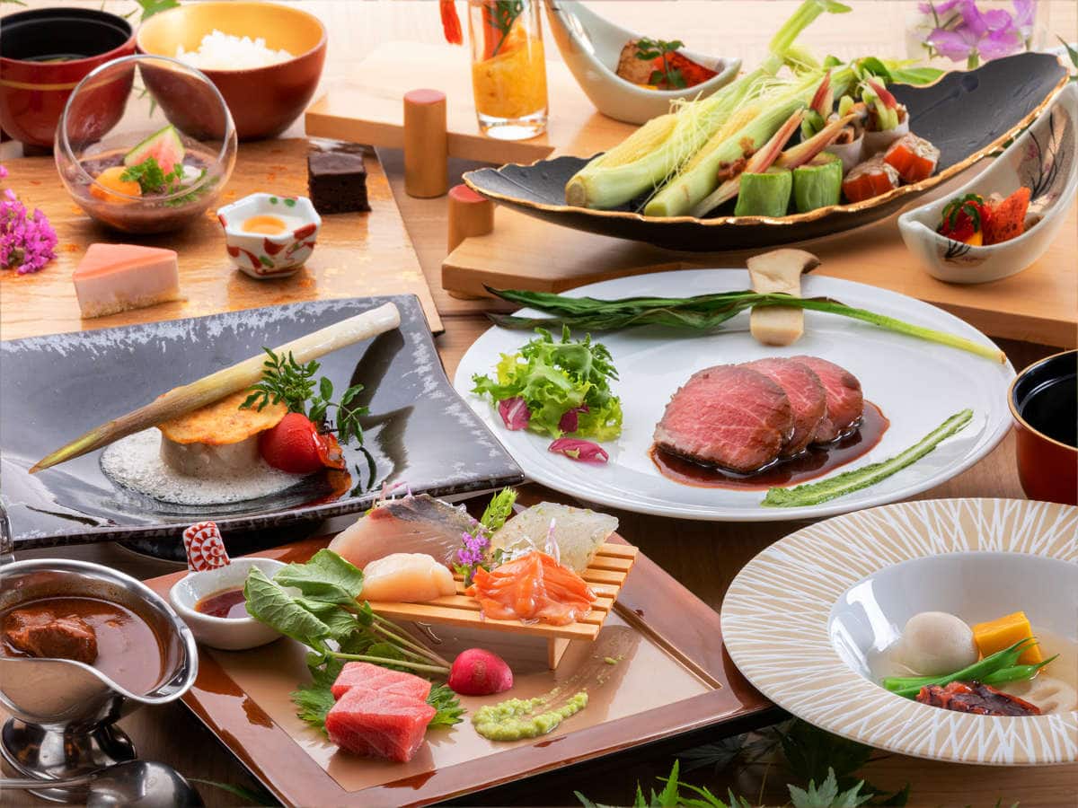 お料理の一例を映します。感染症対策には十分配慮して、バイキングでのご朝食を楽しめます。