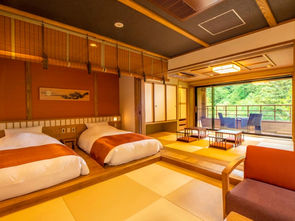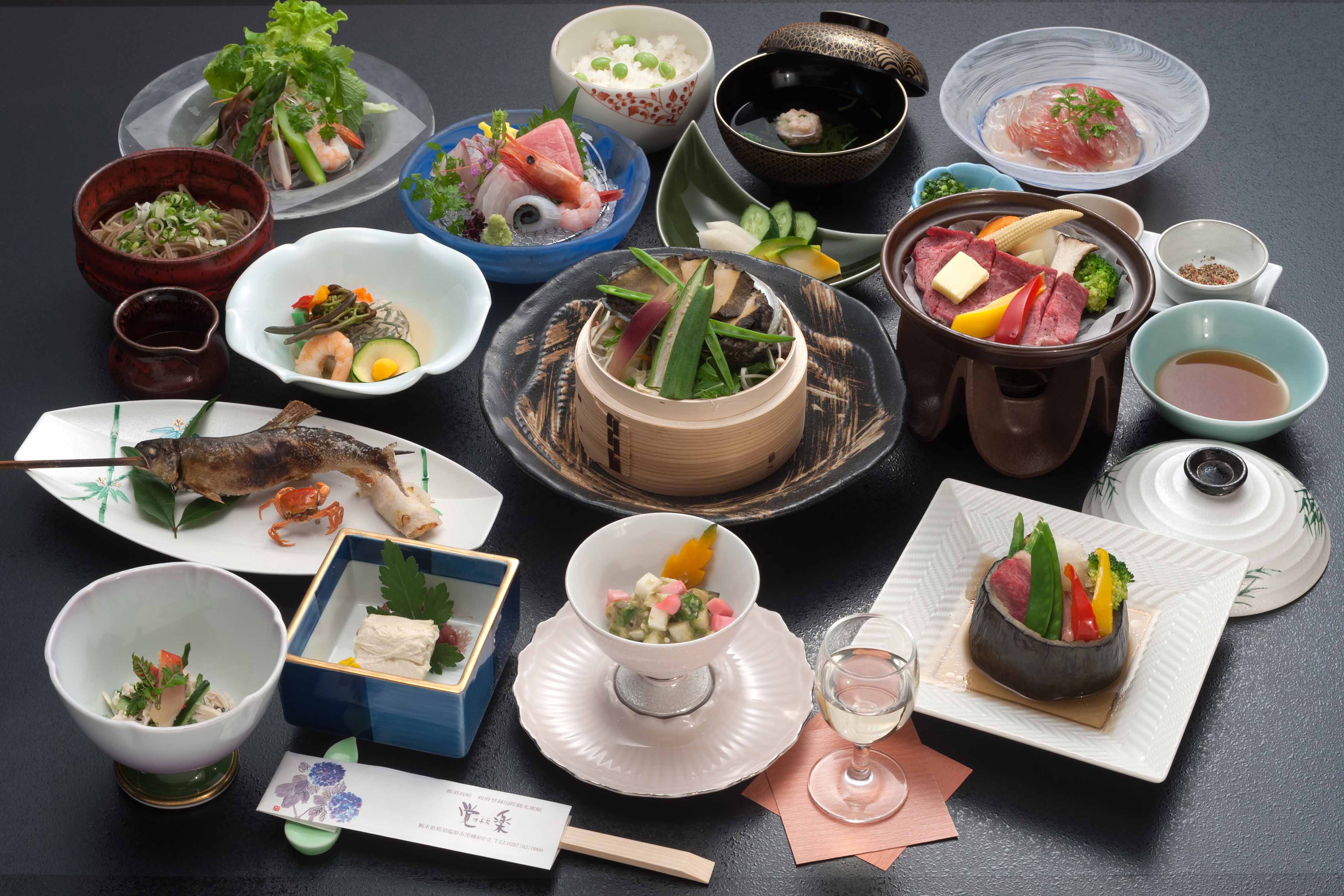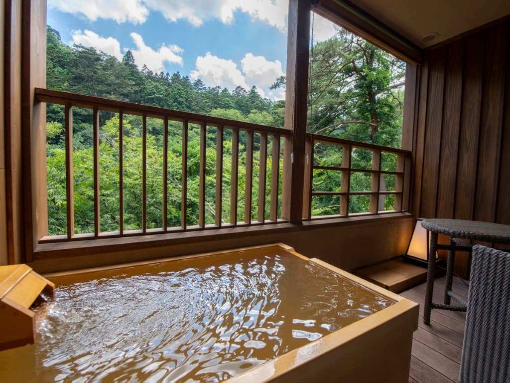 塩原渓谷に佇む、全室天然温泉風呂付きの湯宿です。専用スロープカーで渓谷を下るとそこは、渓流の水の音、心地よい風、そして四季折々の渓谷美が織りなす極上の非日常空間。「美肌の湯」ともいわれる天然温泉を愉しみ、夕食は旬の食材を丁寧に仕立てた逸品の数々を心ゆくまでご堪能いただけます。