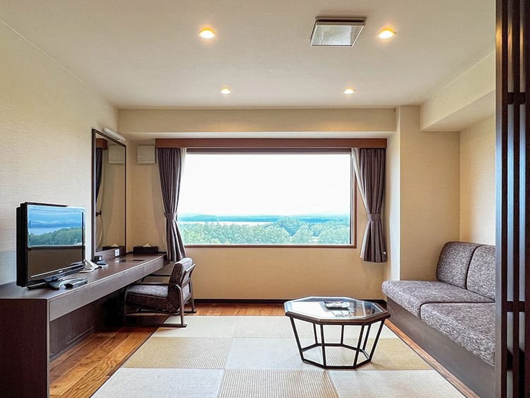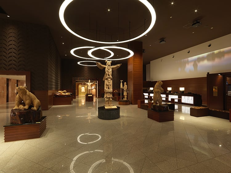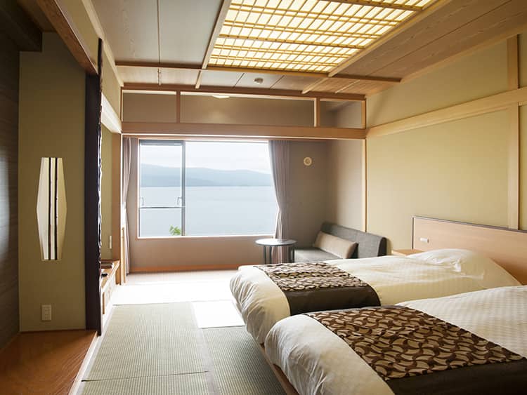1泊目は北天を仰ぐ小高い丘の上に建つ「北天の丘 あばしり湖鶴雅リゾート」に宿泊。2泊目「あかん湖 鶴雅ウイングス」では、阿寒湖で開催される「冬華美」を客室から観賞することができます。