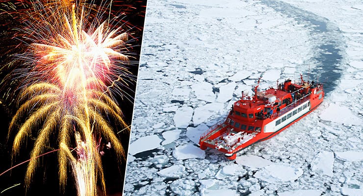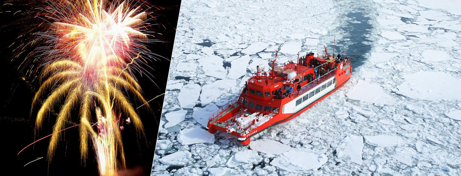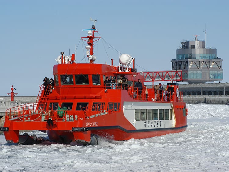 紋別では、「ガリンコ号」に乗ってオホーツク海に浮かぶ流氷が、船体横から浮き上がってくる迫力満点のクルーズをお楽しみいただけます。