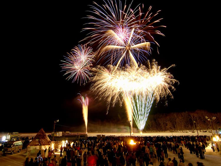 阿寒湖が魅せる冬の風物詩「阿寒湖氷上フェスティバルICE・愛す・阿寒 冬華美」。凍てつくような澄んだ空気のなか、暗闇に華を咲かせる真冬の花火を、宿泊ホテルの客室からご覧いただけます。見る人の心も温まる、感動的な美しさをぜひお楽しみください。