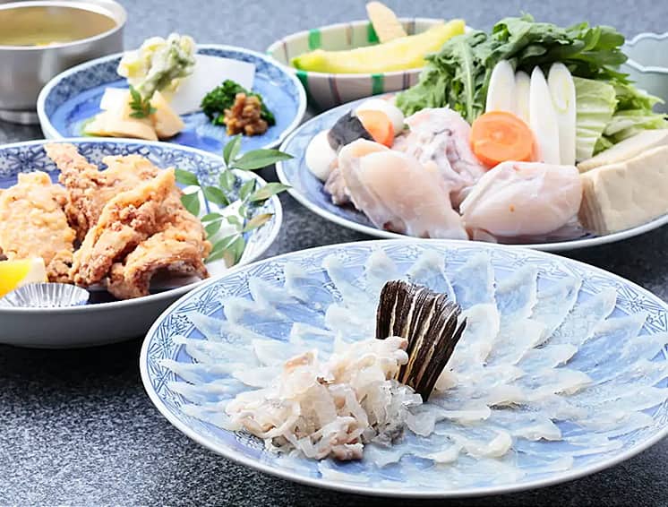 1日目の夕食は冬期限定のふぐコースをお楽しみいただけます。ふぐ刺しやふぐちり鍋だけでなく、いか活造りもご用意しております。また、気軽に博多の水たきを味わえる昼食をご用意しております。