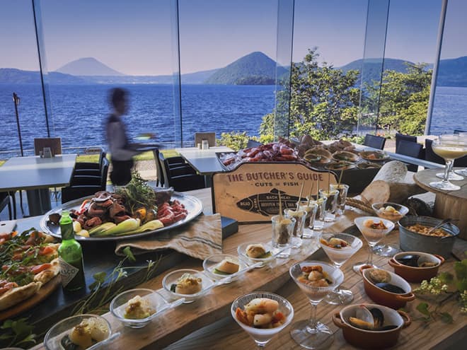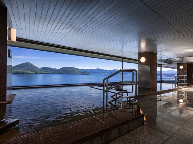 ホテル館内の随所から望める「絶景の洞爺湖ブルー」、客室はもちろん全室レイクビュー。