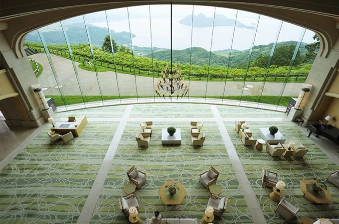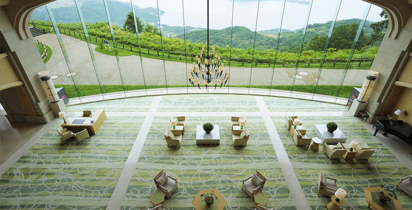洞爺湖の壮大な自然と一体化した解放感あふれるロビー。