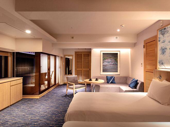 広島市の中心部に位置し、観光やショッピングにも絶好のロケーション。瀬戸内海をイメージしたブルーがアクセントのプレミアムルームはワンランク上の滞在をお楽しみいただけます。