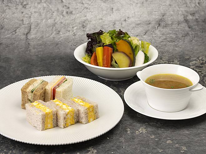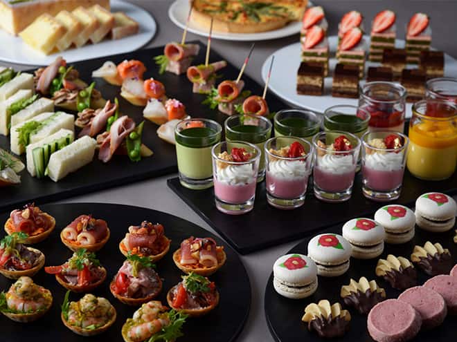 朝食、コーヒーやアフタヌーンティーのほか、イブニングカクテルではスパークリングワインやスタンダードカクテルなどとともに、ホテル内のレストランから日替わりでご提供するメニューもお楽しみいただけます。