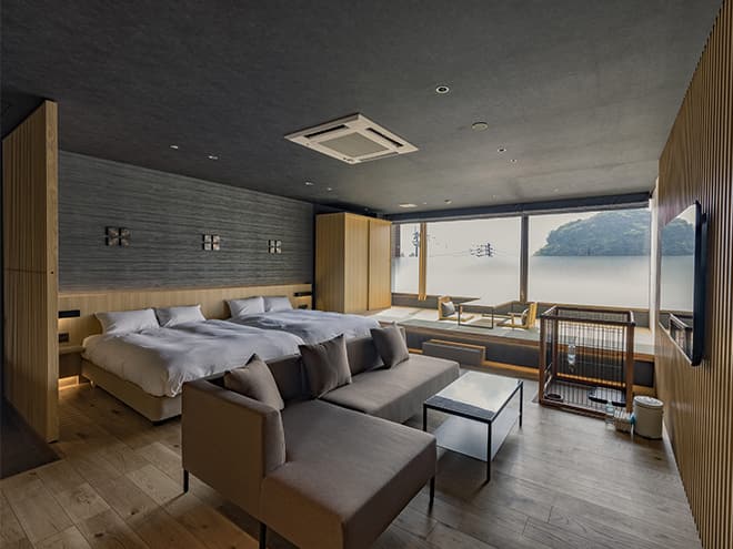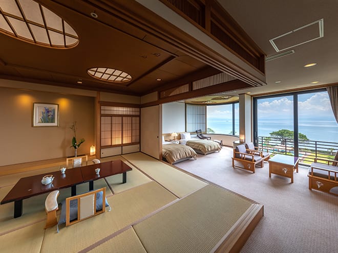 松の緑と青い海に囲まれた豊かな自然の中、日本伝統の佇まいでお迎えいたします。指宿特有の砂むし温泉、日本のお風呂を再現した元禄風呂、旬の素材を活かした和食会席料理など、日本旅館ならではのゆったりとした空間で心ゆくまで癒しの時間をお過ごしください。