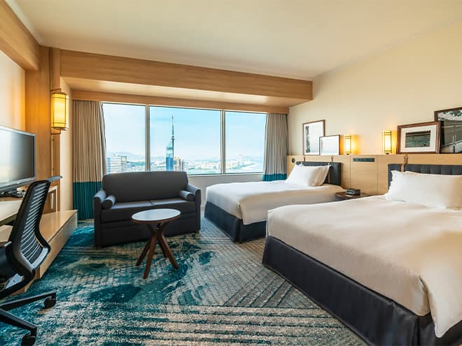 ヒルトン福岡シーホークの魅力は、福岡空港から車で20分、博多駅から15分と便利なロケーション。博多湾に臨むホテルは全室オーシャンビュー。海まで徒歩3分に位置し、都会にいながらリゾート感覚を味わえます。