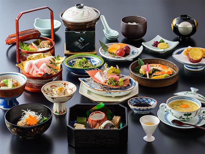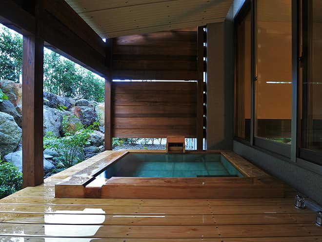 客室は全室温泉露天風呂付き。プライベートな空間と季節のお料理をお楽しみください。