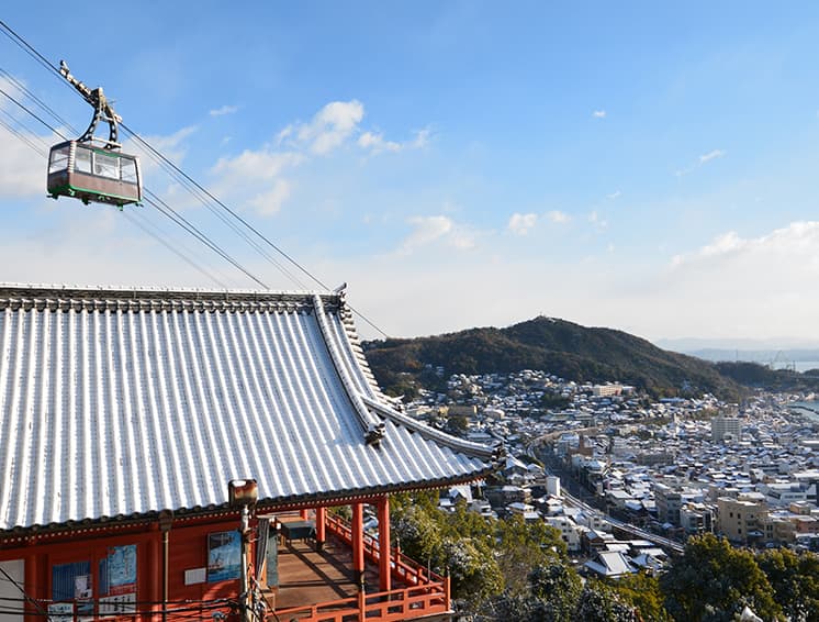 千光寺本堂境内からは、尾道の市街地と瀬戸内海に浮かぶ島々が一望できます。山麓駅~山頂駅間は往復でロープウェイを利用します。