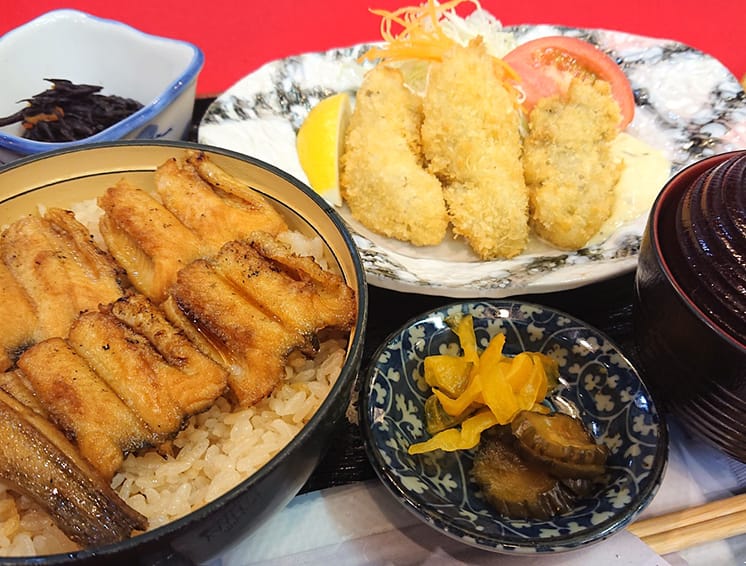 駅弁で販売した事がきっかけで有名となった穴子飯と、焼きガキ、カキフライがついたメニューです。