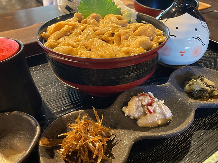 四季折々の魚介、野菜、山菜のいい田のお料理は、逸品ばかりです。使用する魚介は、早朝の水揚げ直後の新鮮なものだけをご提供しています。そして、当ツアーでは、夏が旬のウニ丼をご堪能いただけます。