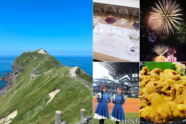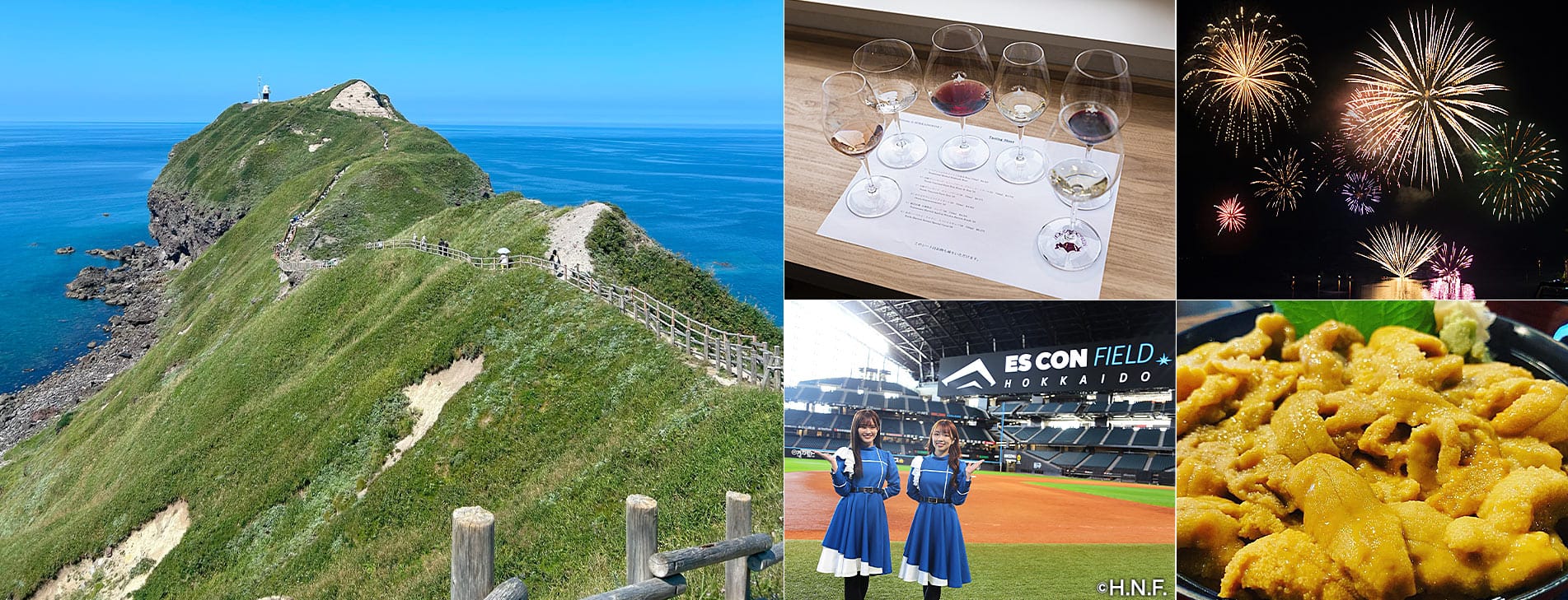 左:神威岬(8月頃) 中央上:小樽ワインギャラリー 中央下:エスコンフィールドHOKKAIDO 右上:洞爺湖ロングラン花火大会 右下:ウニ丼