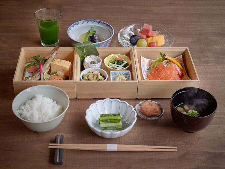 軽井沢プリンスホテル「日本料理 からまつ」が提供する、一の重・二の重・三の重にそれぞれの食材を盛り付け、信州の豊かに育った野菜の素材を生かし添え、また羽釜で炊き上げた五郎兵衛米と信州みそ椀の和朝食をお楽しみください。