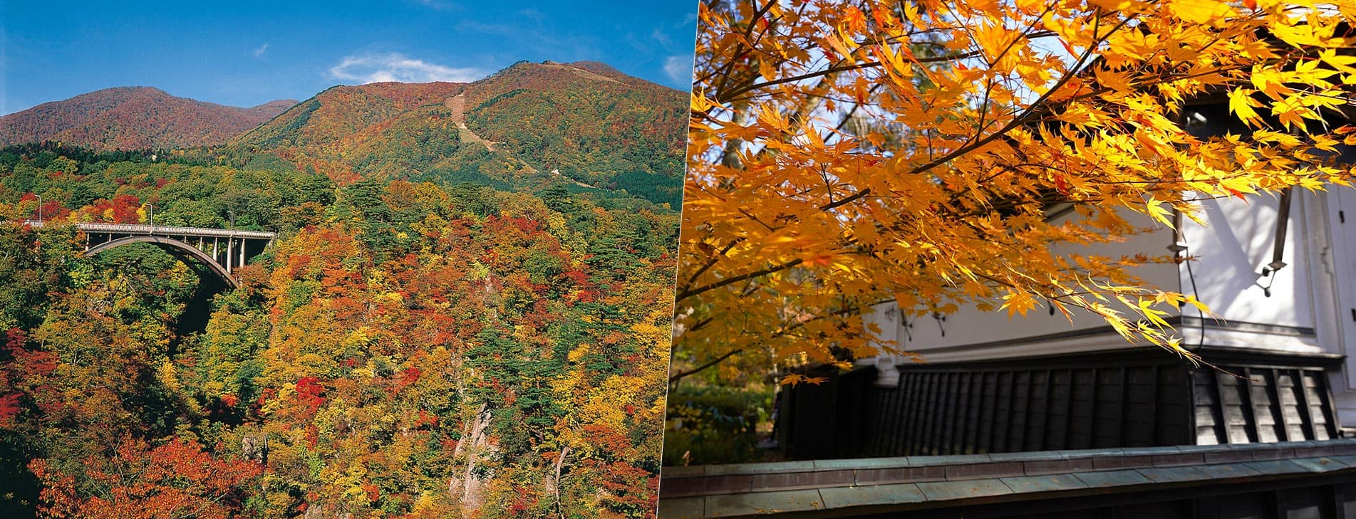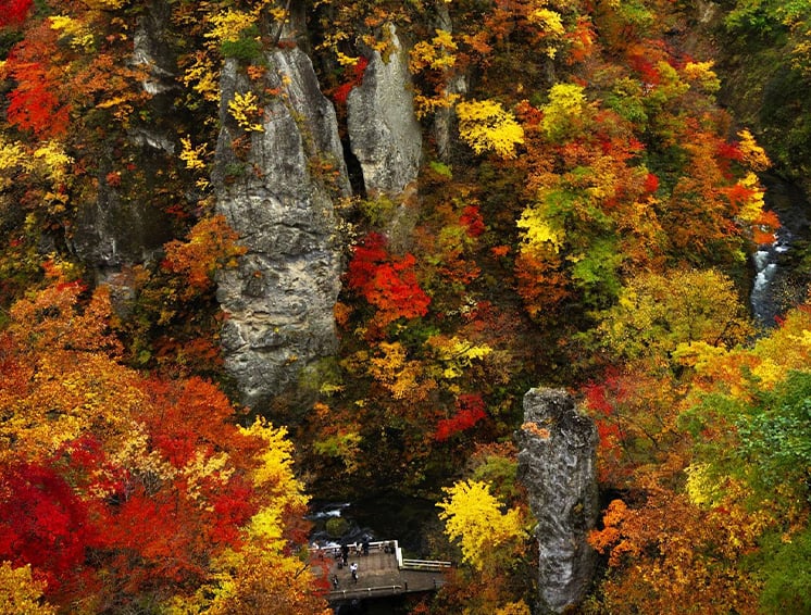 大谷川が刻んだ深さ100㎡の断崖が続くダイナミックな景勝地。岩肌に生える木々が赤や黄色の美しい紅葉に染まります。美しいアーチが印象的な「大深沢橋」は鳴子峡を代表する景観です。