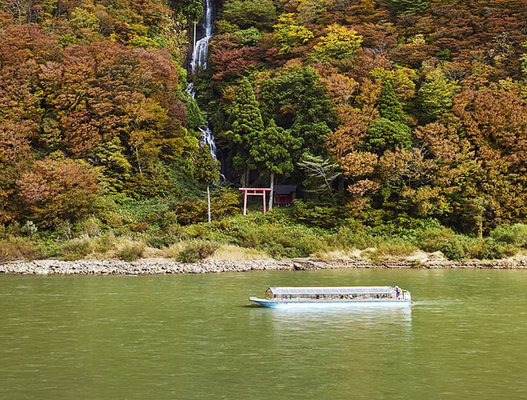 大自然のなかを悠々と流れる最上川をゆっくりと下ります。両岸の山々が紅葉に染まり水面に映る風景を楽しむ約60分の船旅。白糸の滝はみどころのひとつです。