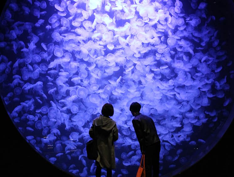 愛称は「クラゲドリーム館」。クラゲの展示種類は世界最大級で、色とりどりのクラゲが漂う幻想的な世界が広がります。