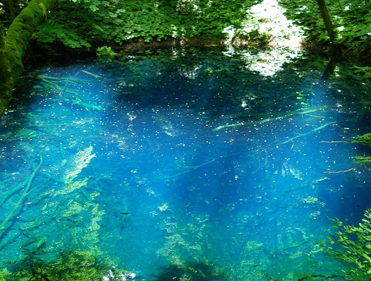 白神山地の一角である津軽国定公園にある十二湖。その中でもっとも有名な青池は、青いインクをたらしたかのような青色でありながら、透明度も高くまさに絶景です。