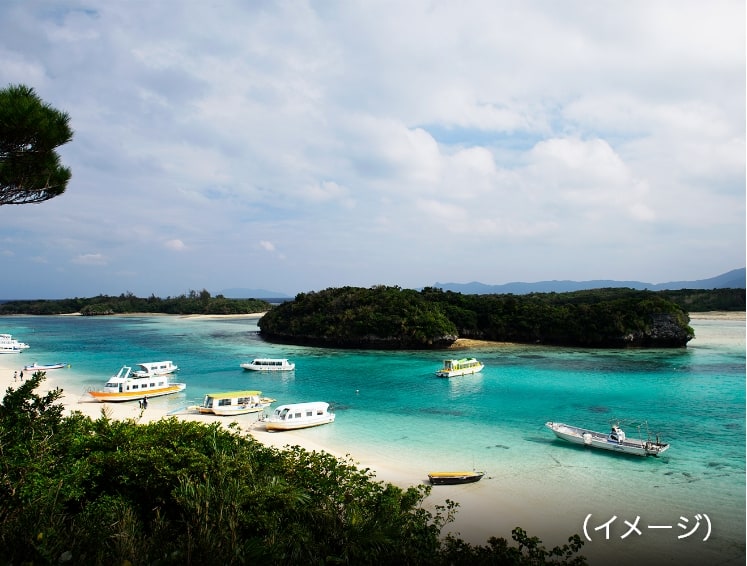美しく澄んだ海を白い砂浜が縁取り小さな島々が並ぶのどかな風景の川平湾でグラスボート遊覧をお楽しみください。