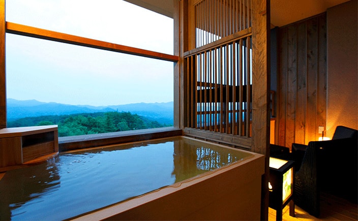 2021年、草津温泉の中心街から少し離れた高台にリゾートホテルが誕生。客室の温泉露天風呂では「湯川の湯」、さらに草津温泉では珍しい最上階の眺望浴場では「湯畑源泉」をはじめとする温泉を満喫いただけます。