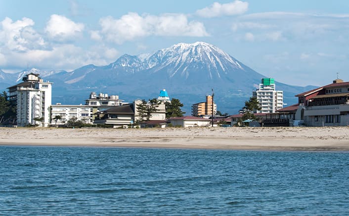 米子市の北側、日本海に面した山陰を代表する海辺の温泉地。白砂青松の美しい海岸線と中国地方最高峰の大山を眺めることができます。