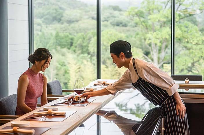 オープンキッチンを囲むように作られたカウンター越しに見えるシェフたちの軽快な動きはまるでライブショー。ご滞在中の特別な夜を演出します。21席限定、ディナーのみ、ぜひ事前のご予約をおすすめします。