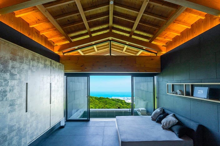 日本の伝統工芸のエッセンスを随所にちりばめ、スタイリッシュでモダンに仕上げたインテリアが、極上のひとときを演出します。テラスには、別府湾を望みながらプライベートに温泉を楽しめる露天風呂を設置。また、贅沢な広さのバスルームは、バスタブと独立したウォークインシャワーや2人同時にお使いいただけるツインシンクを採用しています。