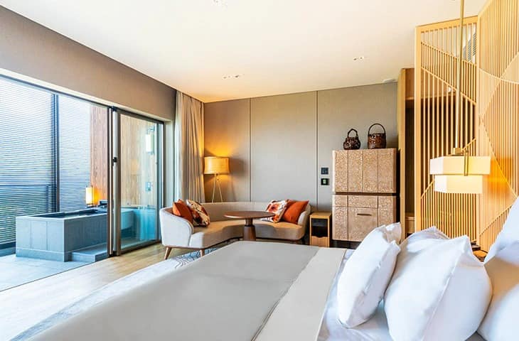 専用ラウンジをご利用いただける「クラブインターコンチネンタル ルーム」。クラブラウンジではチェックイン・チェックアウトや朝食、アフタヌーンティー、イブニングカクテル等をお楽しみいただけます。68㎡のコンテンポラリーデザインの客室には、バルコニーに専用露天風呂も完備。源泉掛け流しのお湯をお楽しみください。