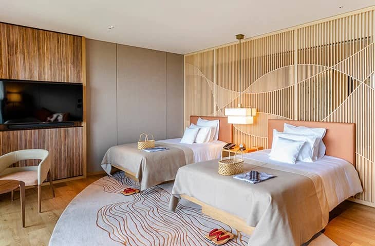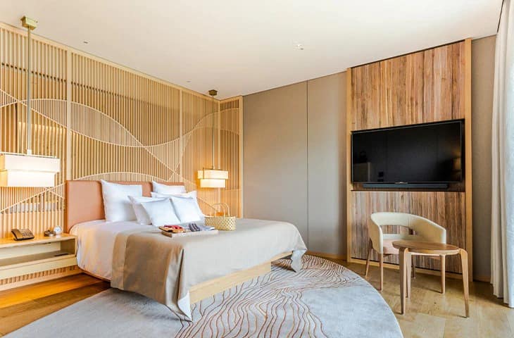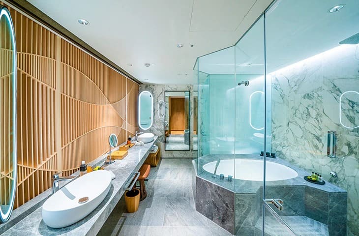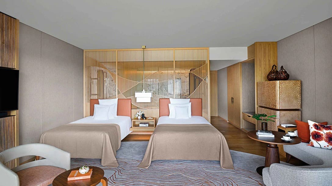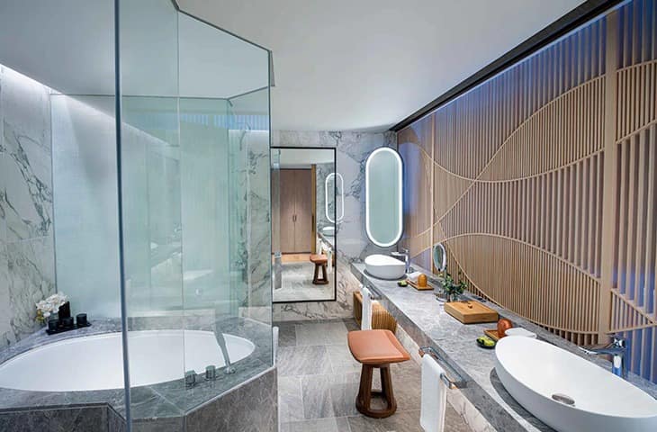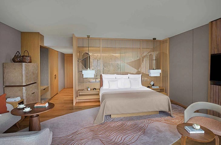 室内を彩る竹細工や組子細工といった精巧な伝統工芸が、モダンな空間に和のエッセンスを加えています。ラグジュアリーな大理石のバスルームには、バスタブと独立したウォークインシャワー、ツインシンクが備わり、ベッドルームとの間を仕切るスクリーンを開けると、窓からの自然光が差し込むと同時に、天井まである全面ウィンドウからの景色を楽しめます。