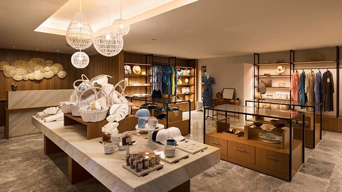 ハレクラニブティックでは、ホテルロゴ入りのウェアやフレグランスキャンドル、ブランケット、手作りのテディベア、ハレクラニ沖縄オリジナルのパンケーキミックスや厳選された沖縄の工芸品などをお求めいただけます。ここでしか手に入らないアイテムの数々は、旅の思い出、そして、ギフトとしてもご活用いただけます。