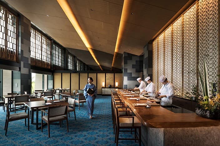 日本料理「AOMI/青碧蒼」は、空の青、海の碧、山の蒼が美しい沖縄が育む豊かな食材と、日本各地から届くとびきり旬な味覚をふんだんに味わえる美食空間。南の島にいながら、日本の四季を感じていただけます。