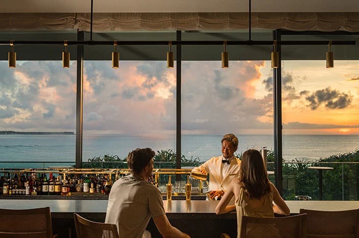 サンセットウィングのロビーに位置する「サンセットバー スペクトラ」は、雄麗な夕陽を眺める最高のスペース。刻々と幻想的に色彩を変えながら、やがて漆黒の世界へと沈みゆく空と海のパノラマが圧巻です。