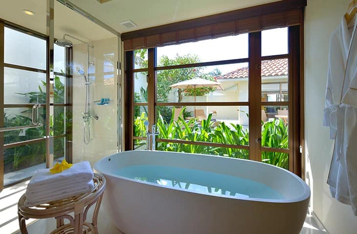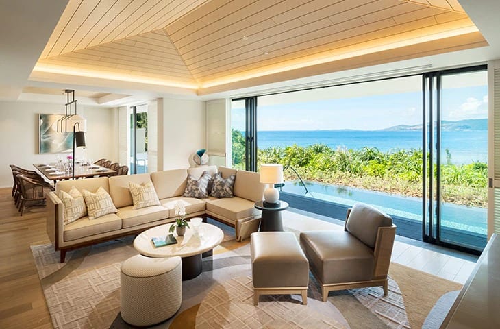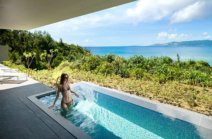 目の前に東シナ海の大海原が広がるハレクラニクリフヴィラは、空の青と海の碧を壮大に見わたせるクリフトップに佇む特別な空間。楽園リゾートの優雅な華やぎを感じていただけるヴィラには、温水のプライベートプールと天然温泉を完備。大切な人とプライベートな時間を充実させたいゲストや周囲に気兼ねなく贅沢な休日を過ごしたいファミリーにおすすめ。