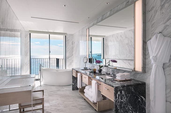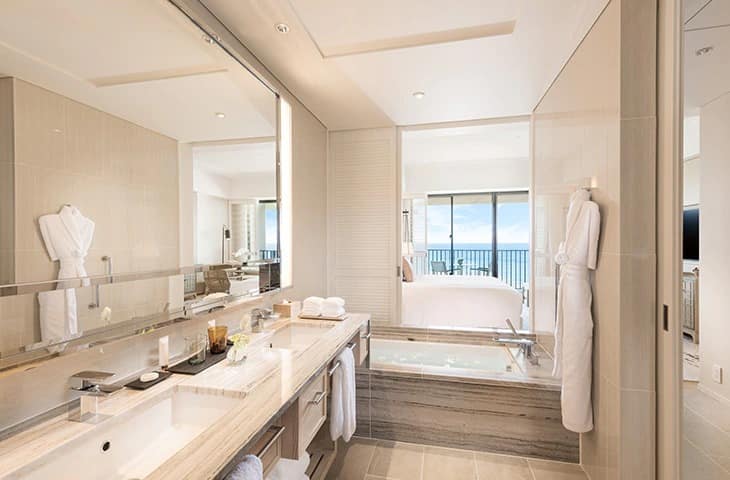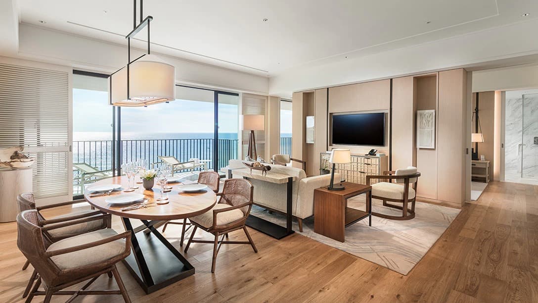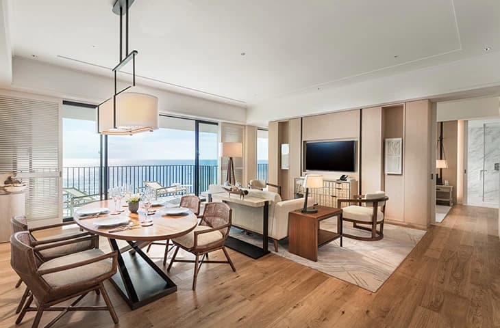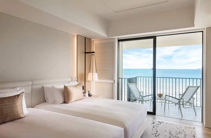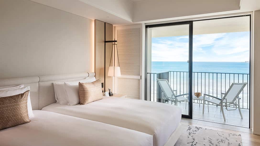 オーキッドプールを見下ろすビーチフロントウイングの上層階に位置し、優美な南国の光に祝福される爽快なゲストルーム。50m2の広々とした客室は、ハワイのハレクラニ同様に7色の白を基調とした内装。青く輝く美ら海を一望するオーシャンビューが、ゲストの心を晴れやかに解き放ちます。