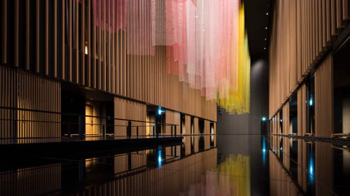 5階から8階までのゲストルームフロアではエレベーターの扉が開くと、巨大な染色インスタレーションが目に飛び込んできます。色と光をまとった薄羽のような美しい絹の布は自然界からの贈り物。ホテル内で出逢える「染司よしおか」の作品です。