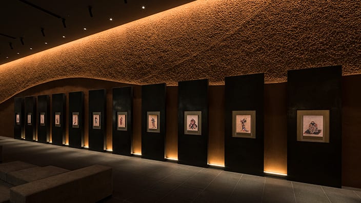 ロビーに並んだ貴重な肖像画が皆様をお出迎え。原画「夷酋列像(いしゅうれつぞう)」は絵にも優れた才を持つ蠣崎波響(かきざきはきょう)によって描かれ、現在はフランスのブザンソン美術考古博物館に所蔵されています。
