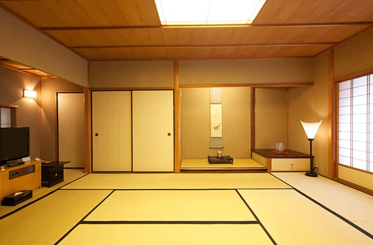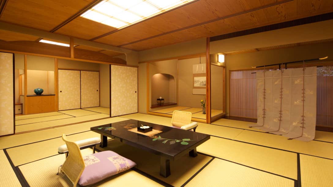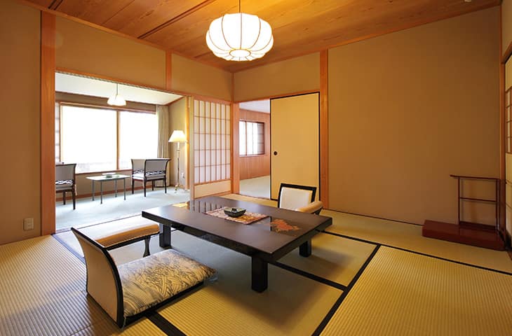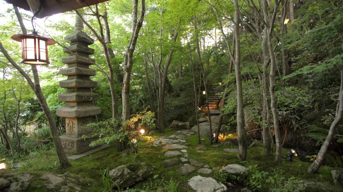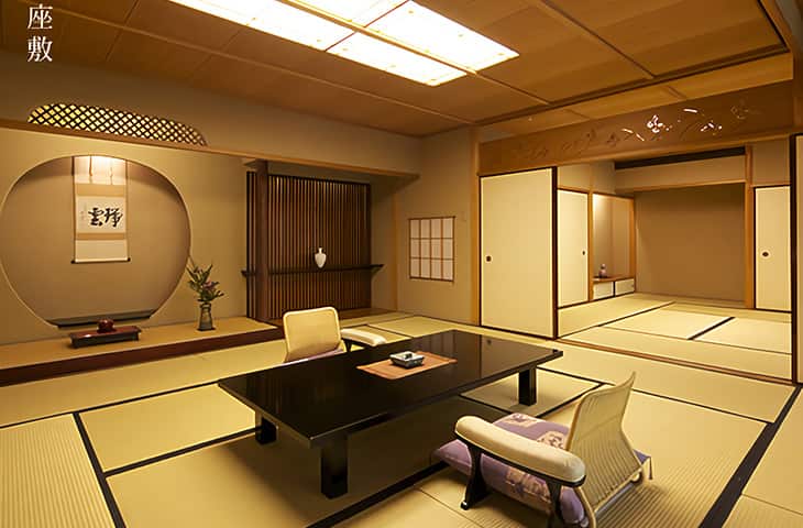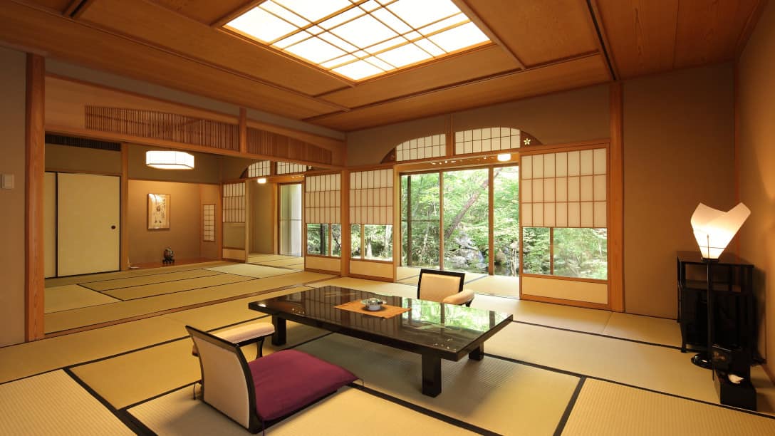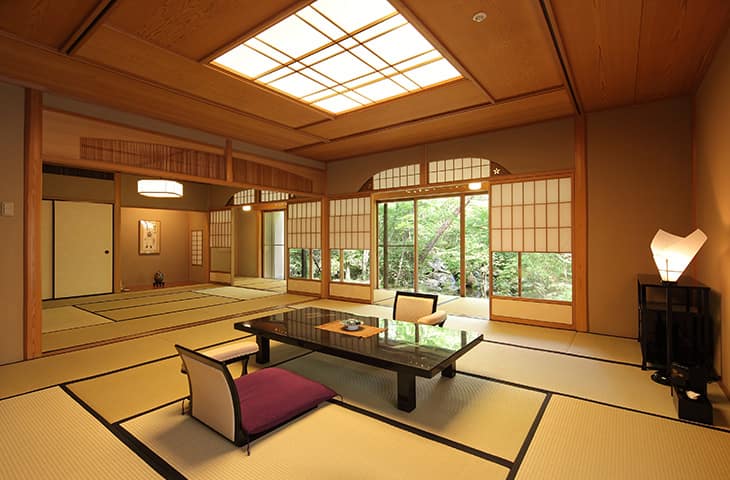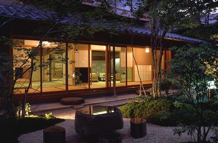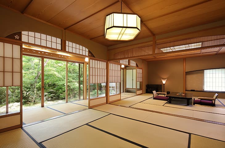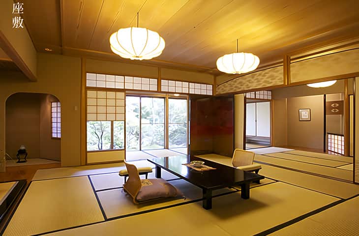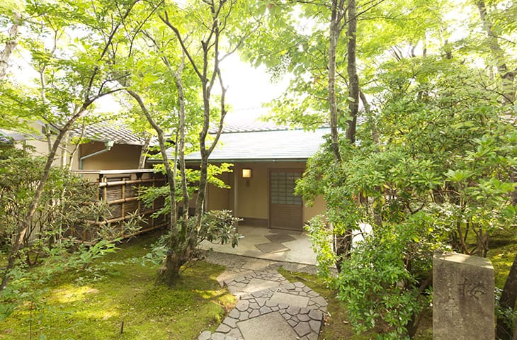 広大な6000坪の敷地にたった14棟の客室。緑と自然あふれる広大な敷地の中に点在する日本建築。宮大工がそれぞれ趣向を凝らし創り上げた空間で過ごす贅沢なひと時。四季折々の景色、心を癒す日本庭園はお客様の心を癒し、至福の時間へと誘います。