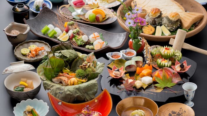 島原半島の山海の幸を使用した月替わりの本懐石料理。器選び、盛りつけなど、細部に至るまでこだわっており一品一品お部屋までお運び致します。