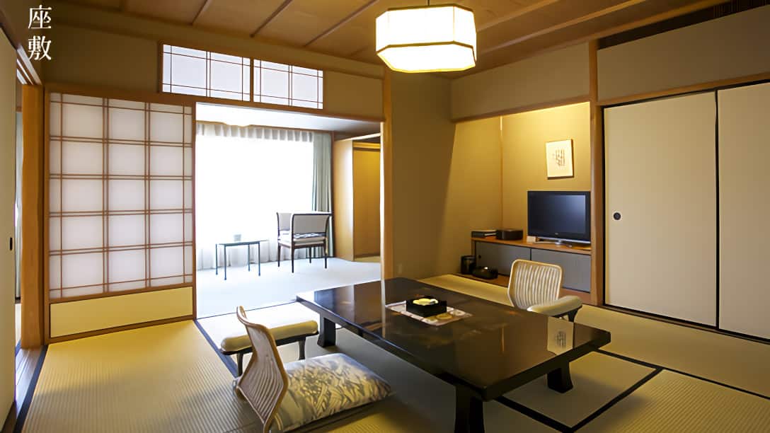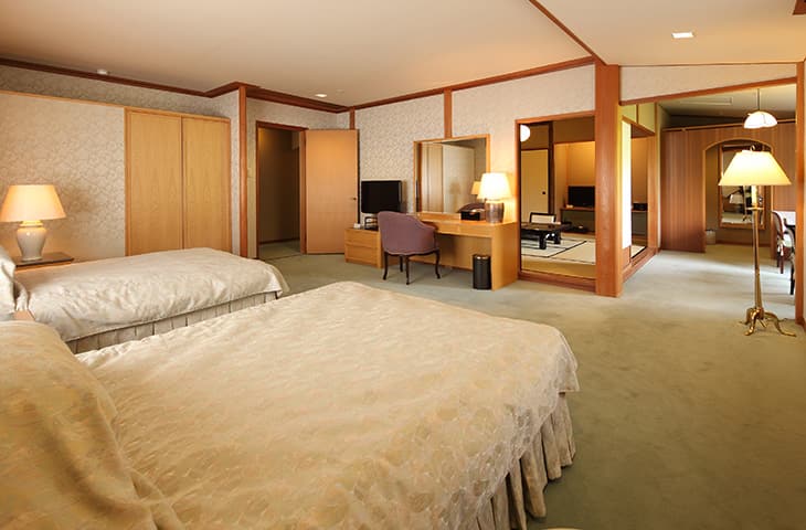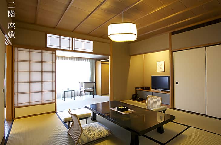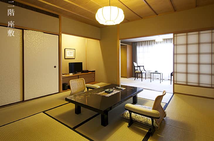 穐月明氏の水墨「二躰仏」の微笑みと香炉からくる香に迎えられ旅の疲れをほぐす。ひと部屋ひと部屋に、さり気なく配された贅をこらした調度。表情豊かに石と流れを配した庭が絶景。