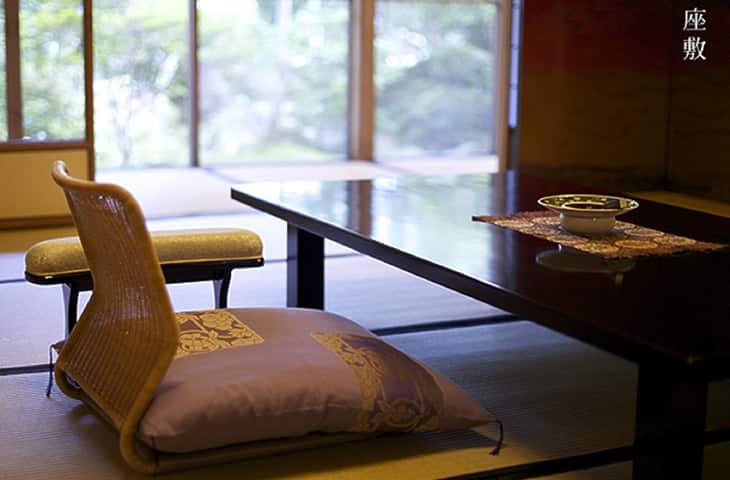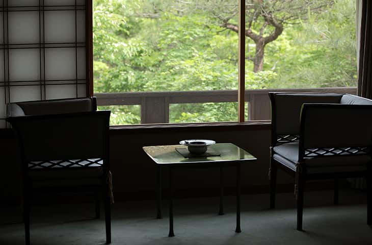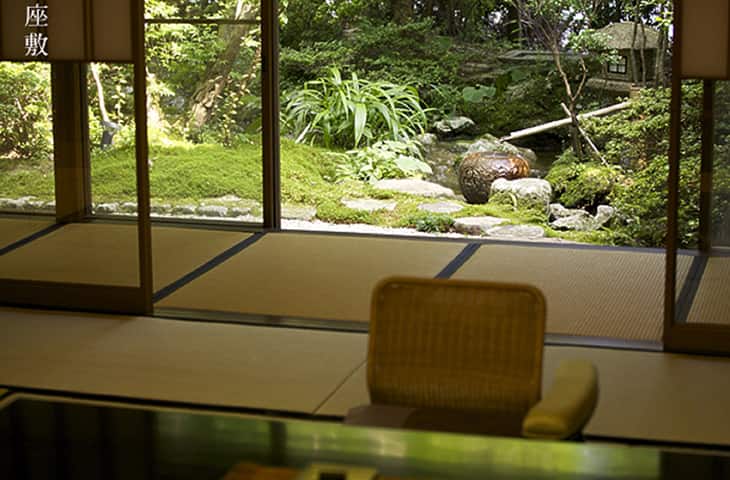 京の宮大工の技が生きる床の間には、穐月明氏の「鉢中の天」の額、墨彩に映える辰砂の香炉。庭は、山々の陵線を借景に、せせらぎの音が心地よく響き、時折聞こえてくるのは旅情を潤す鳥の囀り