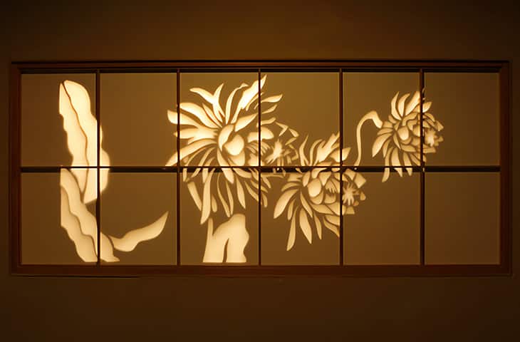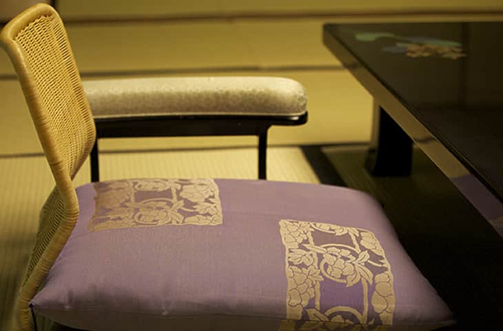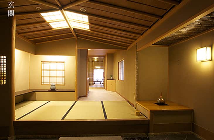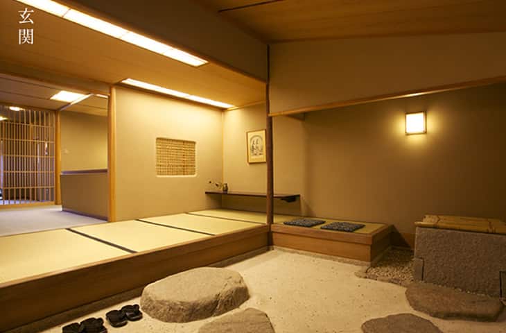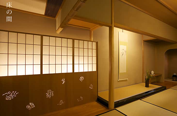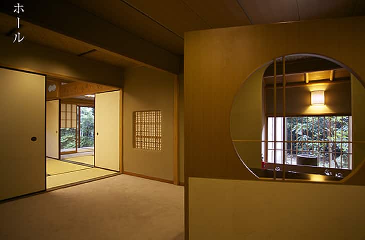 せまる裏山の緑を背景に、景石を大地より岩の一部がせり出したかのように配し、筧で引いた水を石の節理を利用して落とす。広間には季節の美しさを表す几帳が配され、贅をつくした料理を愛で美酒を交わす宴に華やぎをそえる。