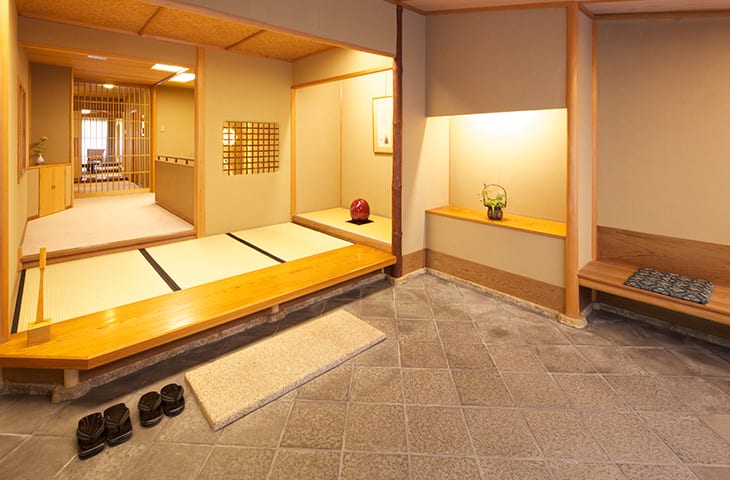 玄関の引き戸を開けたときの心憎い演出・・・。ゆったりとした空間に井戸をしらえ飛び石を配した風情。懐かしき日本への郷愁にも似た思いを呼び起こす。二階より一階へと迎えば玄関先では聞こえなかった水の音が聞こえ、もてなしの香が薫る。