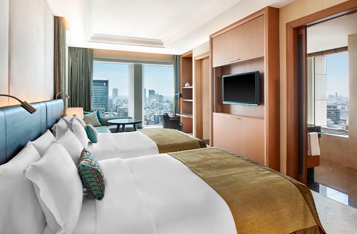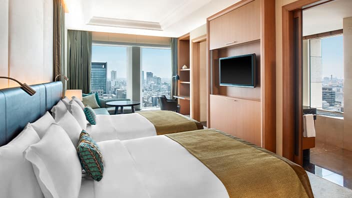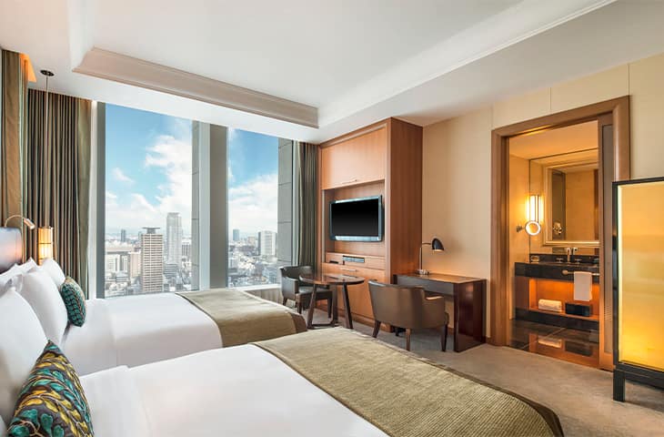 モダンな居住スタイルに、落ち着いた和の要素と洋のディテールを組み合わせたデラックスルーム。キャラメル色とクリーム色の心地よい室内には、ヒスイ色とゴールドの絹の枕や、上質なエジプト綿を重ね、日本や大阪を象徴する銀杏や桜の花のモチーフをあしらった、川島シルクのヘッドボードを備えた贅沢なダブルベッドを2台備えています。