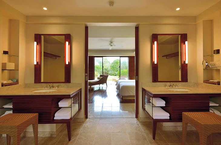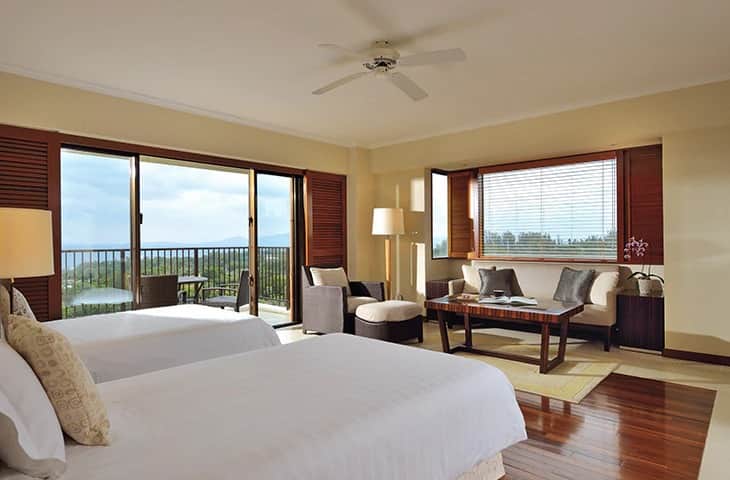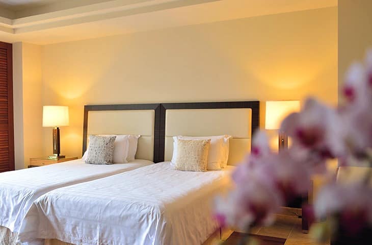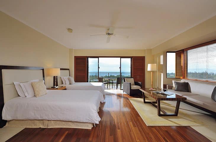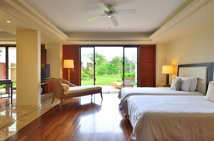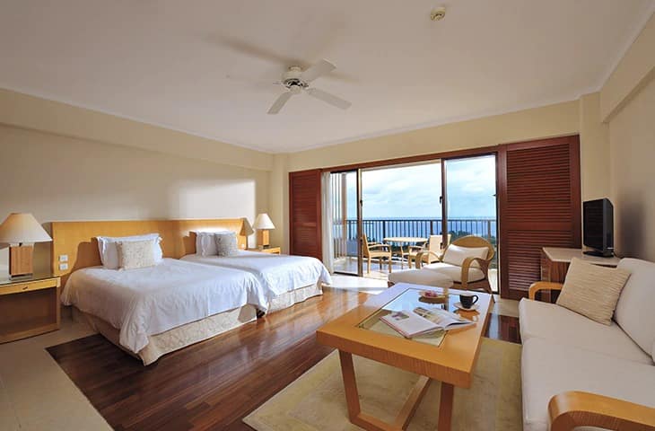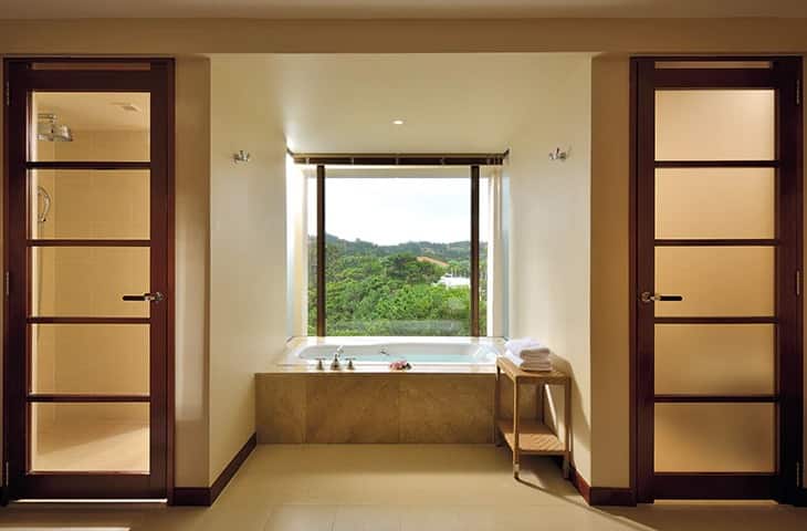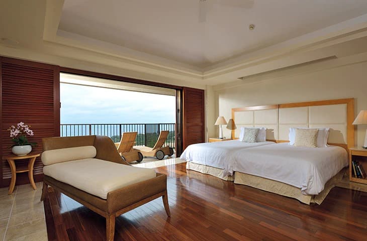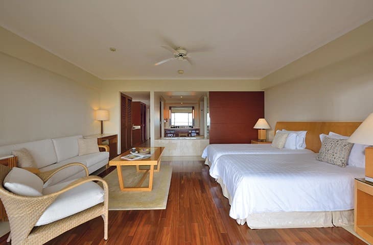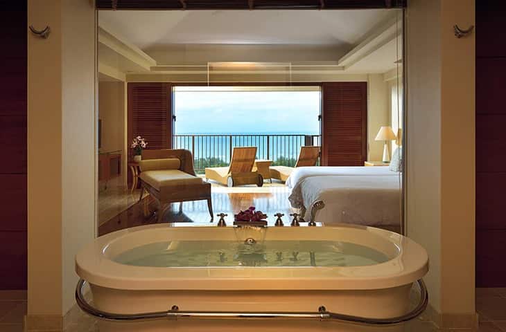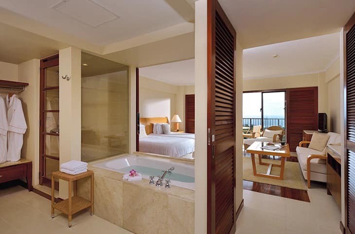 ベッドルームとバスルームの境を取り払い、開放感と明るさ、ゆとりの広さを提供。バスルームのスライドドアを大きく開けば、バスタブからベッド越しにテラスの向こうに広がる南国の空や緑を臨めるデラックスルームです。