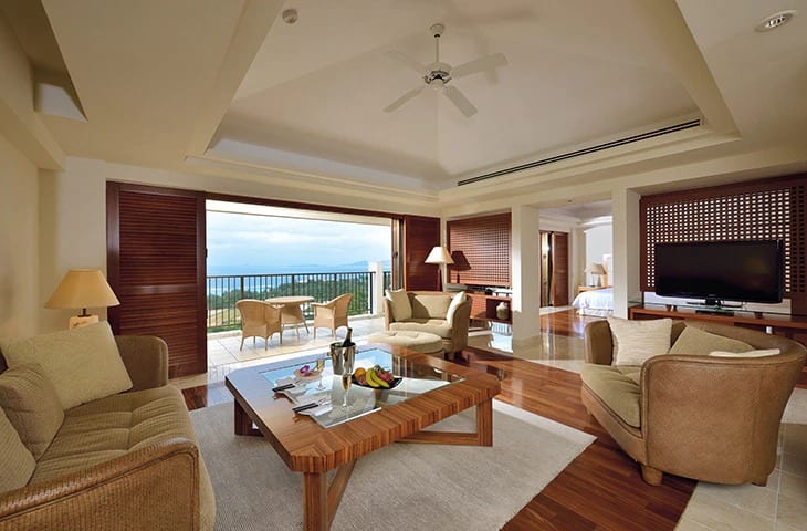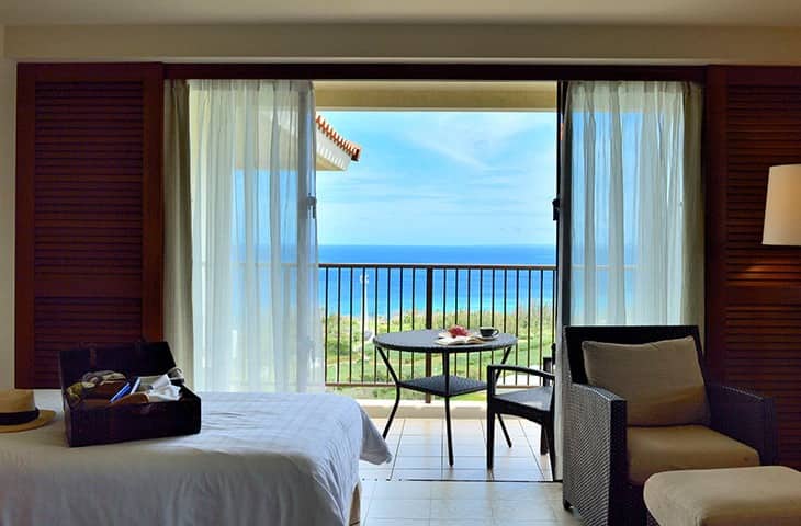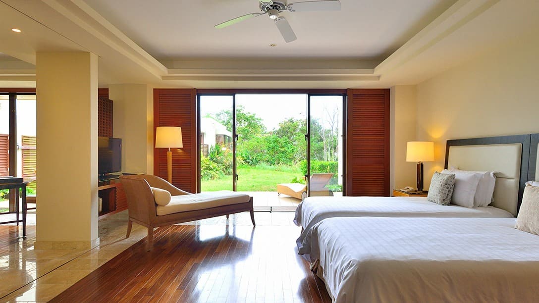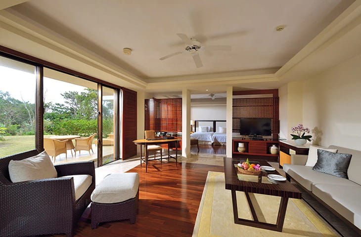 コーナールームの立地を活かし、大きな窓とテラスを設えました。森に向かって開かれた窓からは、なだらかな稜線を描く恩納岳やザ・ガーデンが臨める贅沢なレイアウトが特徴です。