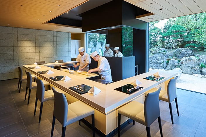 割烹、 天ぷら、鮨の3つのカウンターのほか、ホール、個室、茶室まですべてを備えた「山里」は、ホテルの和食堂として最高峰をめざします。一品料理からオーダーメイドのコースまで、幅広く提供します。