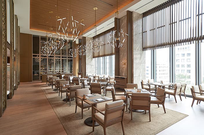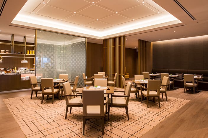 オープンキッチンから繰り出す、オークラ人気ディッシュの数々。吹き抜けが印象的な広々としたホールを中心に、早朝から深夜まで、あらゆるニーズに応えます。