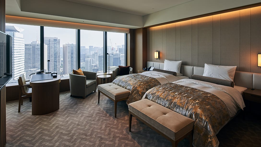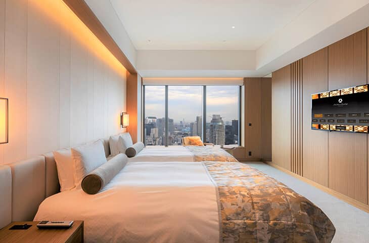 客室は 28 階〜36 階に位置し、6.0〜7.2m と広い間口を構え、広さは 48㎡、窓からは地上約 120〜190m のパノラマが広がります。客室は浴室の窓を大きく取ったビューバスタイプと、3 ベッド対応が可能なワイドリビングタイプを用意し、最高のリラックスタイムを提供します。