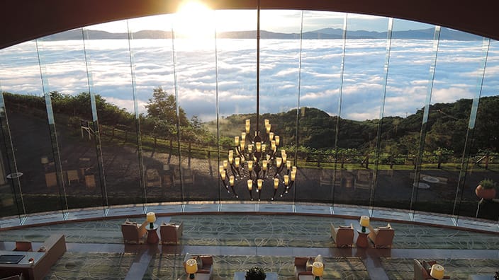 標高約625mの山頂にたつこのホテルでは、メインロビーの巨大なガラス窓から、青く澄んだ洞爺湖をはじめとした洞爺の大自然をパノラマで眺めることができます。季節や気象条件によっては、幻想的な雲海を見ることも。生演奏のウェルカムミュージックも心地よく、非日常の寛ぎを演出いたします。